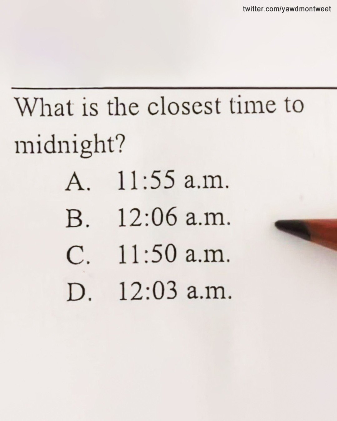 “The closest time to midnight would be D. 12:03 a.m.”