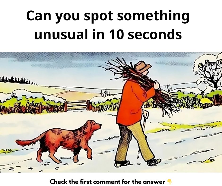 That’s the twist—while the dog has left a clear trail in the snow, the man hasn’t left any footprints. This subtle inconsistency is easy to miss if you’re focused on larger details like the man’s attire or the snowy background. It’s a clever play on our assumptions about how things “should” work in real life.