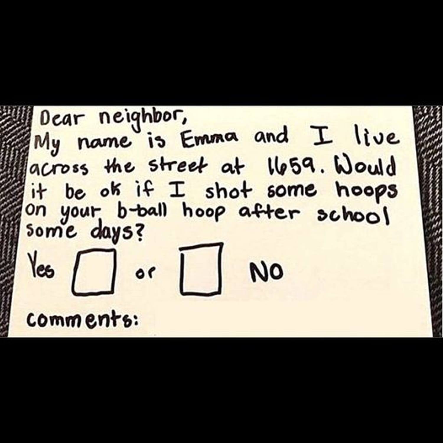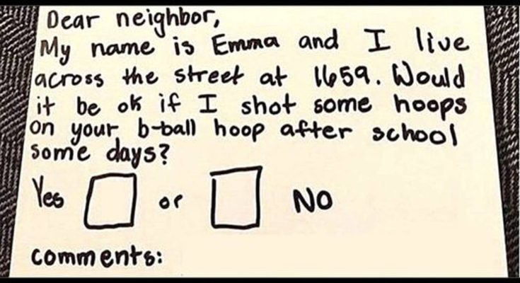 The young child wanted to utilize the basketball hoop that her neighbors had in their driveway after noticing it. In a message, she requested to play hoops after school and requested that they reply, returning the note to her mailbox.