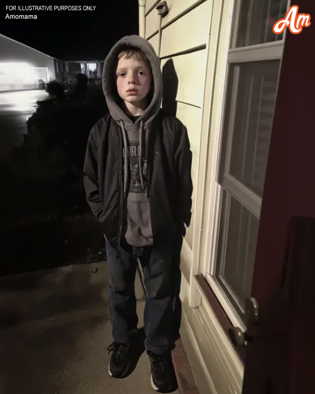 A young teen boy standing on a porch at night | Source: Midjourney