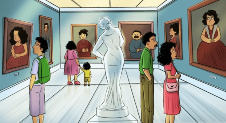 Before jumping to conclusions, let’s take a moment to study the image carefully. With people scattered around, statues, and paintings in the background, it’s easy to miss details or mistake objects for people.