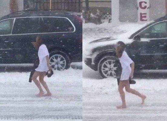 Perhaps oblivious to the blistering cold, or spurred on by a bet, the unidentified brunette was captured on film running through Morgantown, West Virginia, in nothing but a white T-shirt.
