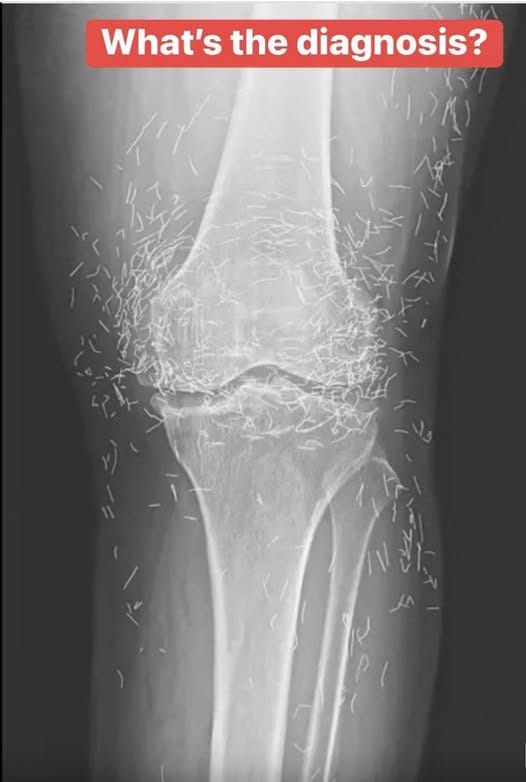 Years later, when doctors took X-rays to evaluate her knee condition, they weren’t prepared for what appeared on the images. Her knees were filled with dozens of bright, metallic flecks — tiny needles embedded deep within the joint area.