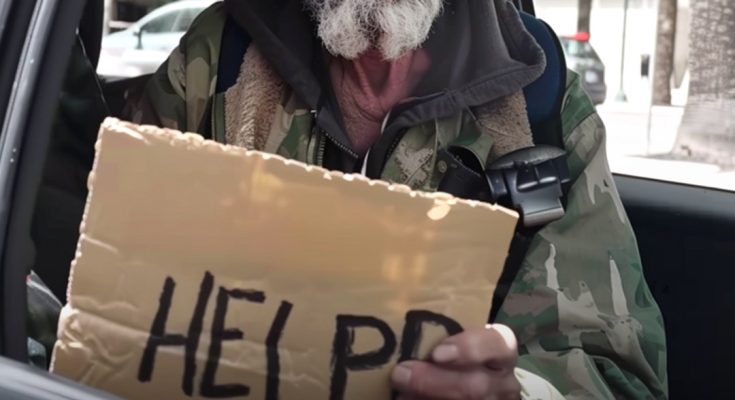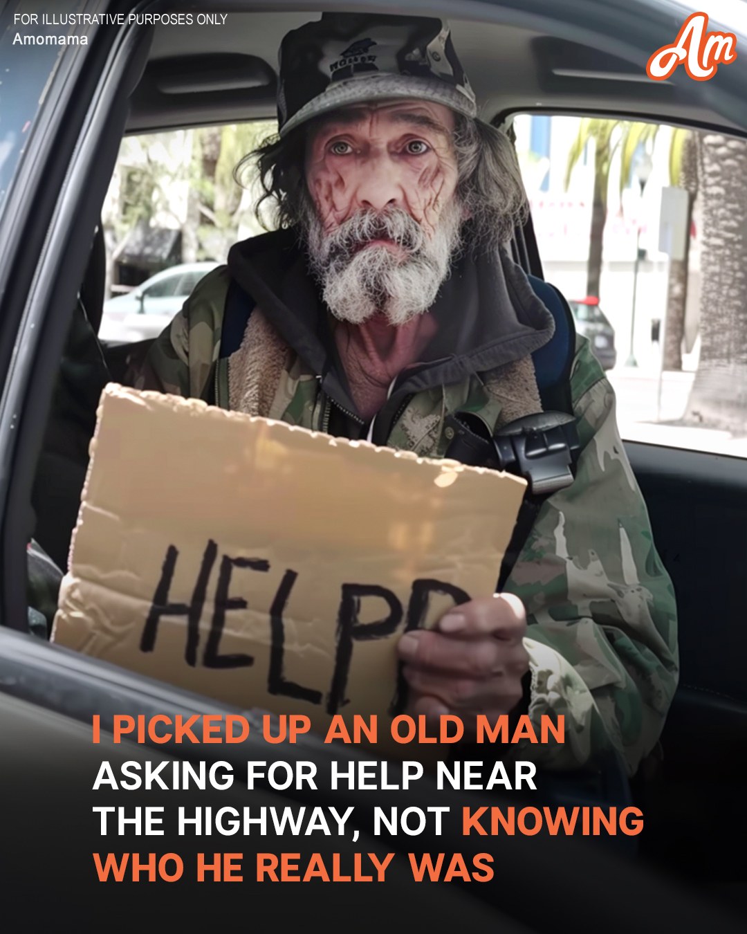 I looked out the side window and saw a man in very dirty clothes. He was holding a sign that said “help” and was slowly limping towards my car.